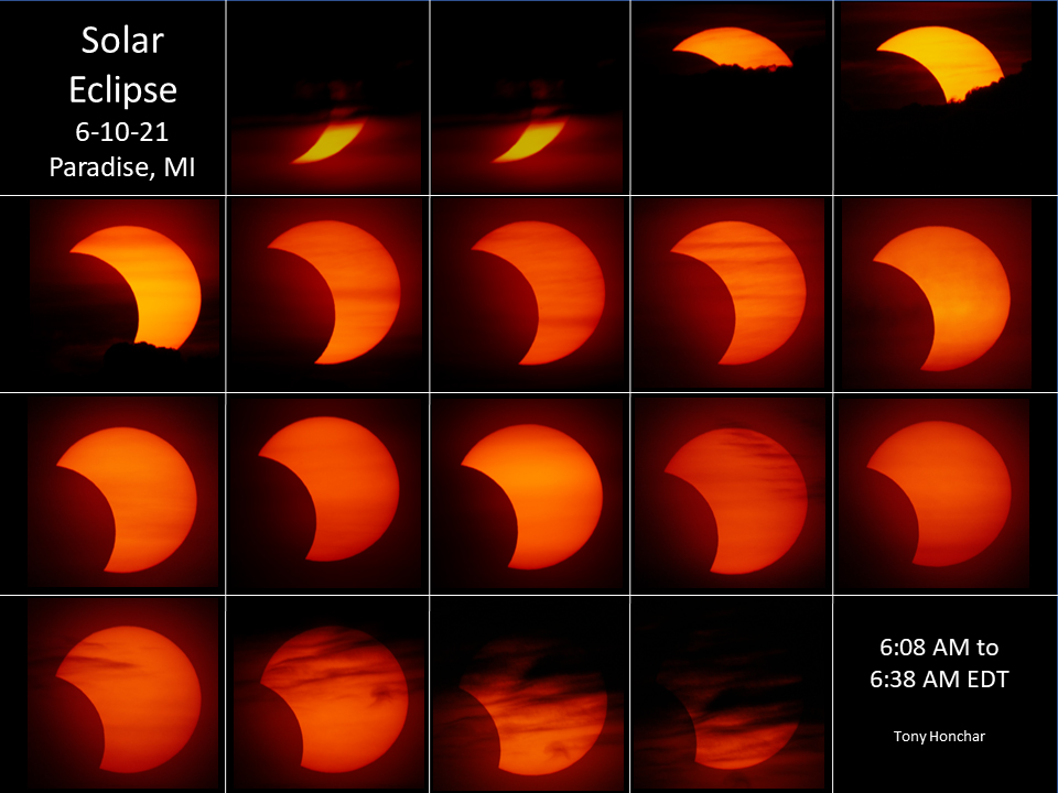 | Traveled to Paradise, Michigan to catch this Partial Solar Eclipse at Sunrise. Unfortunately we had a low cloud layer that covered the horizon for approximately 20 minutes. The Sun finally emerged out of the clouds and I was able to capture about 30 minutes of the waning eclipse. |