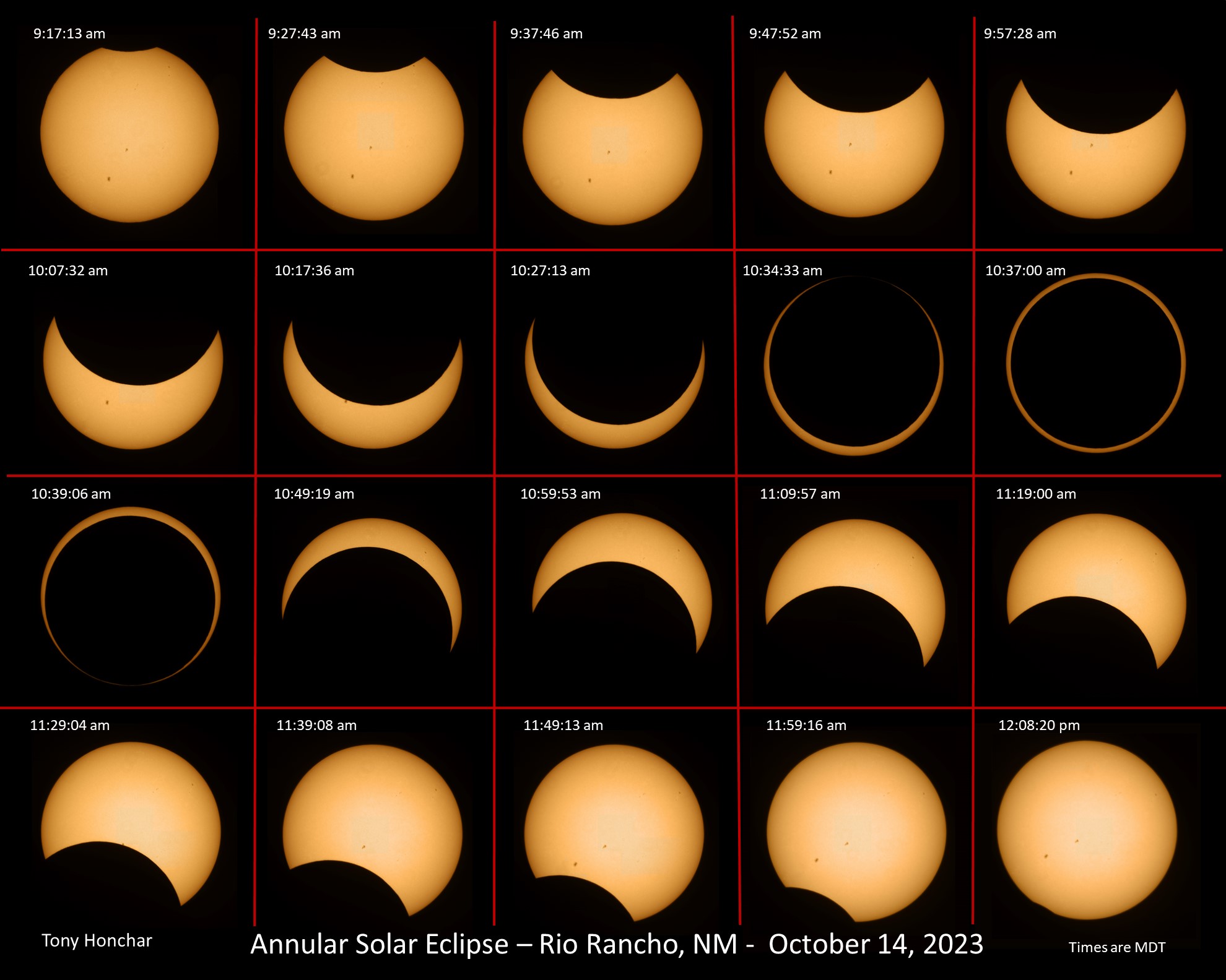 The second row shows the Sun at 2nd Contact, at Mid Eclipse and then at 3rd